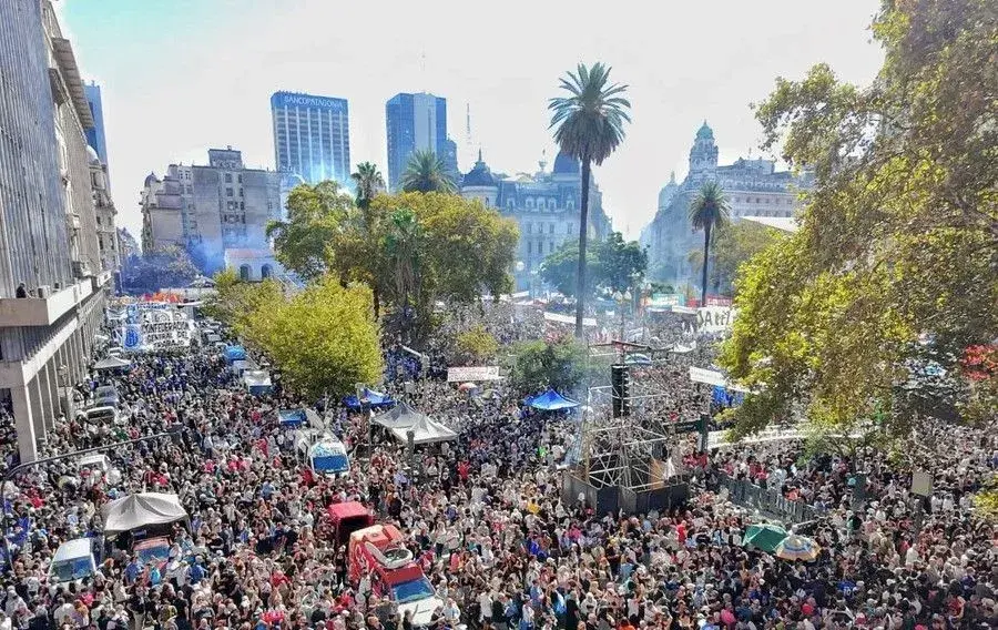 La multitud respondió con cánticos y consignas que atravesaron la plaza, entre ellas una que sintetizó el clima de la jornada: “Milei basura, vos sos la dictadura”.