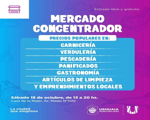 Este sábado 18 de octubre, de 13 a 20 horas, la Casa de la Mujer será nuevamente sede del Mercado Concentrador, una iniciativa de la Municipalidad de Ushuaia que ofrece alimentos frescos, artículos esenciales y productos de emprendedores locales a precios accesibles. La propuesta busca fortalecer el consumo local, la economía social y la soberanía alimentaria.