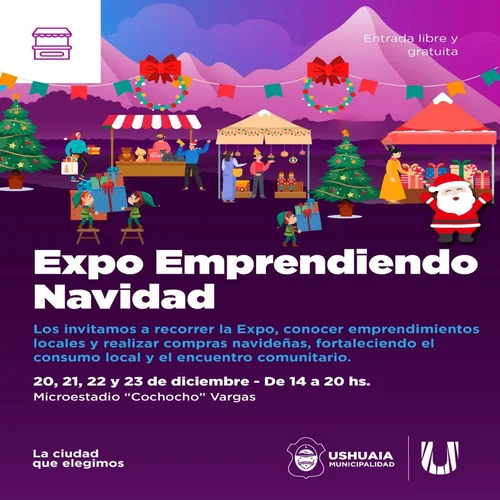 Ushuaia: La Municipalidad de Ushuaia, a través de la Secretaría de Políticas Sociales, Sanitarias y Derechos Humanos, invita a vecinos y vecinas a participar de una nueva edición de la Expo Emprendiendo Navidad, que se desarrollará del 20 al 23 de diciembre, de 14 a 20 horas, en el microestadio municipal “Cochocho” Vargas.